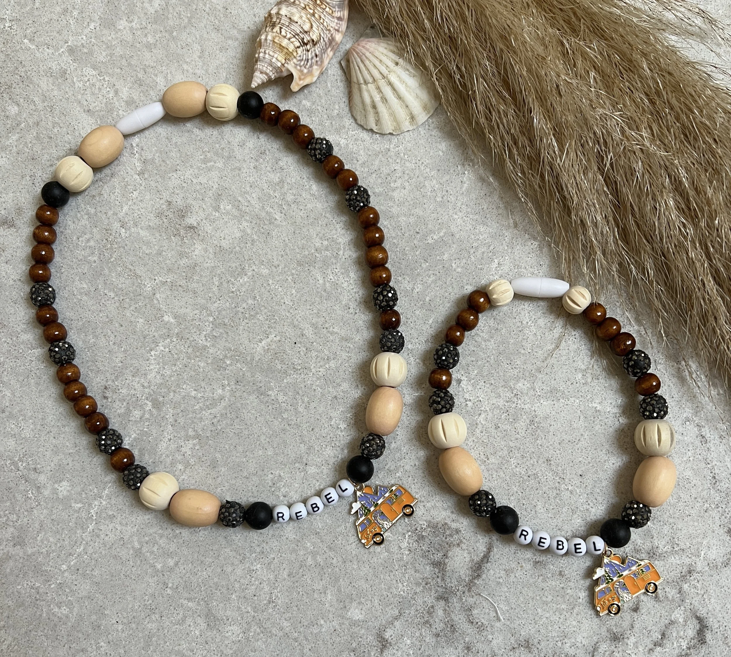 The Rebel Pet Necklace by Isy & Cris offers that Boho Chic vibe in neutral colors, perfect for the boys too! Rebel in acrylic letter beads are centered. A fun camper van charm dangles to the side. Black silicone, black rhinestone, natural wood and an acrylic break-away clasp completes the design. Customize Rebel to your pet's name or another short word or phrase.