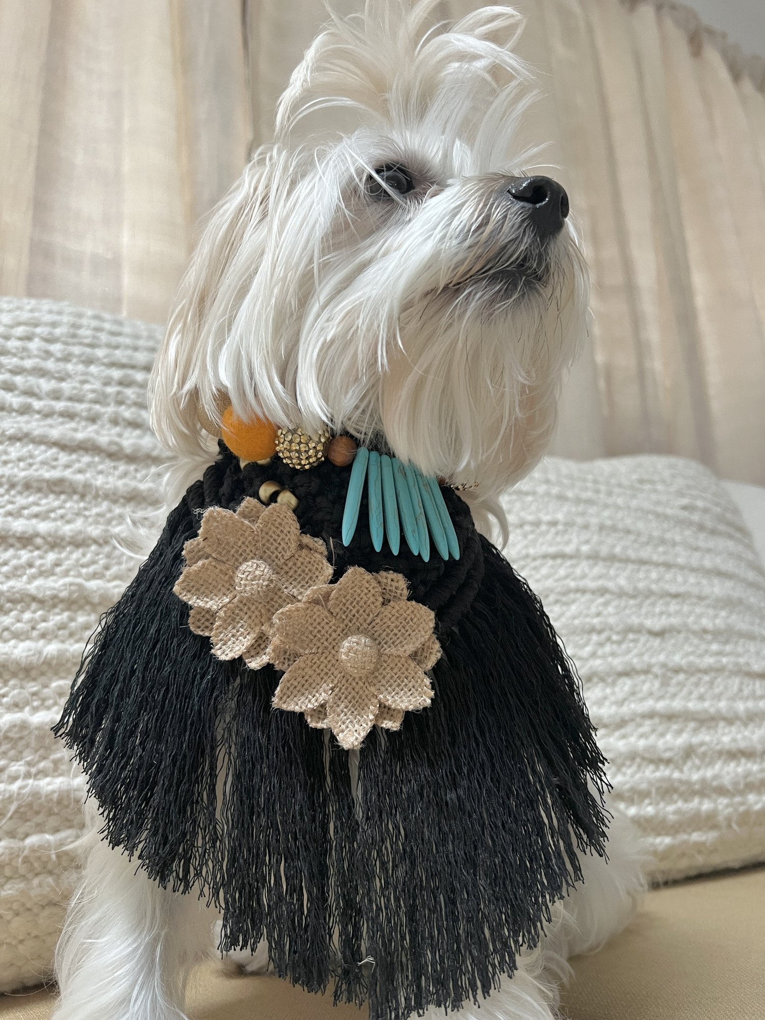 Macrame is another common design element in boho chic fashion for dogs. Macrame can be used on clothing or accessories, such as collars, leashes or bandanas, and can add a playful and bohemian touch to an outfit.