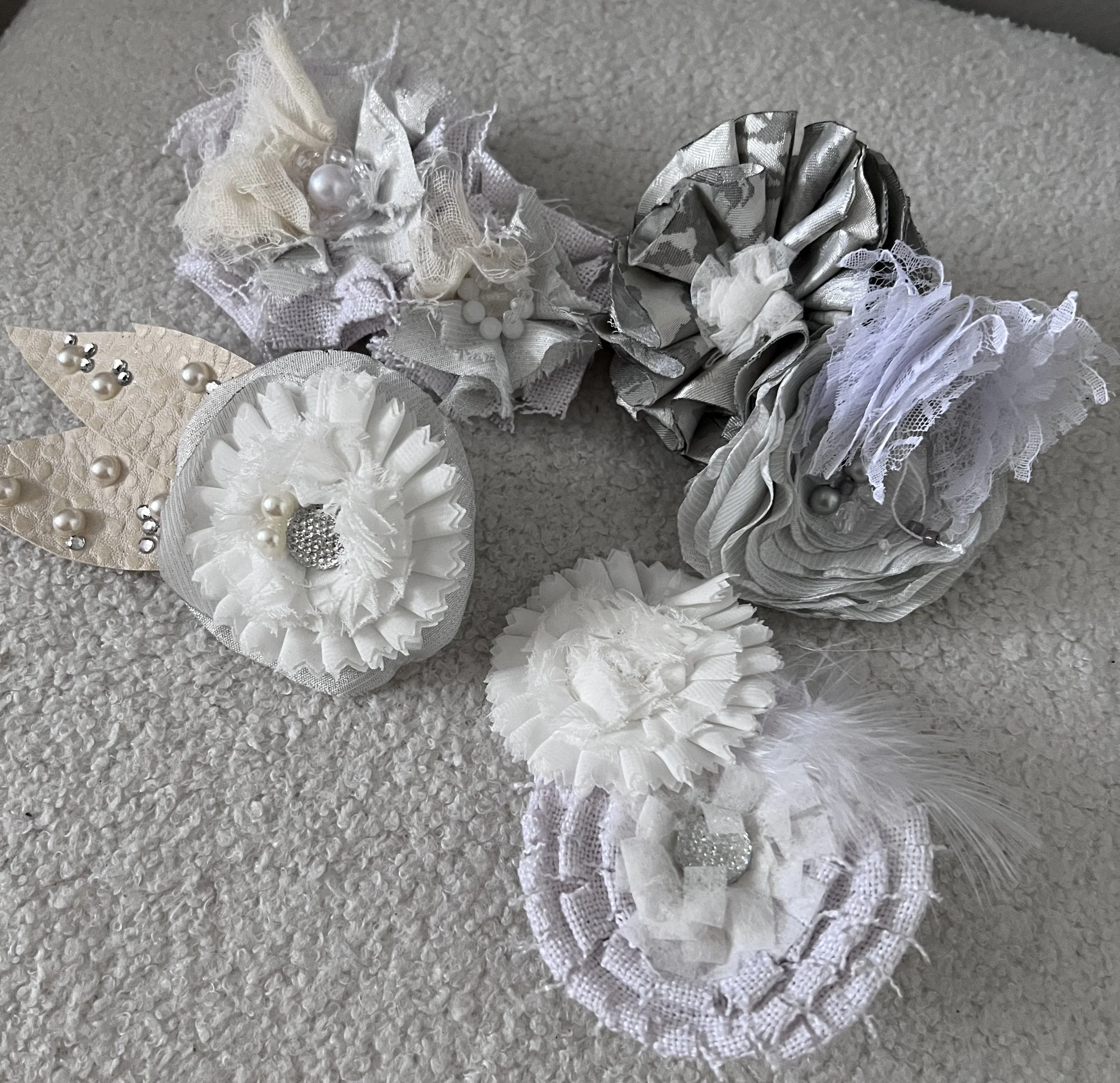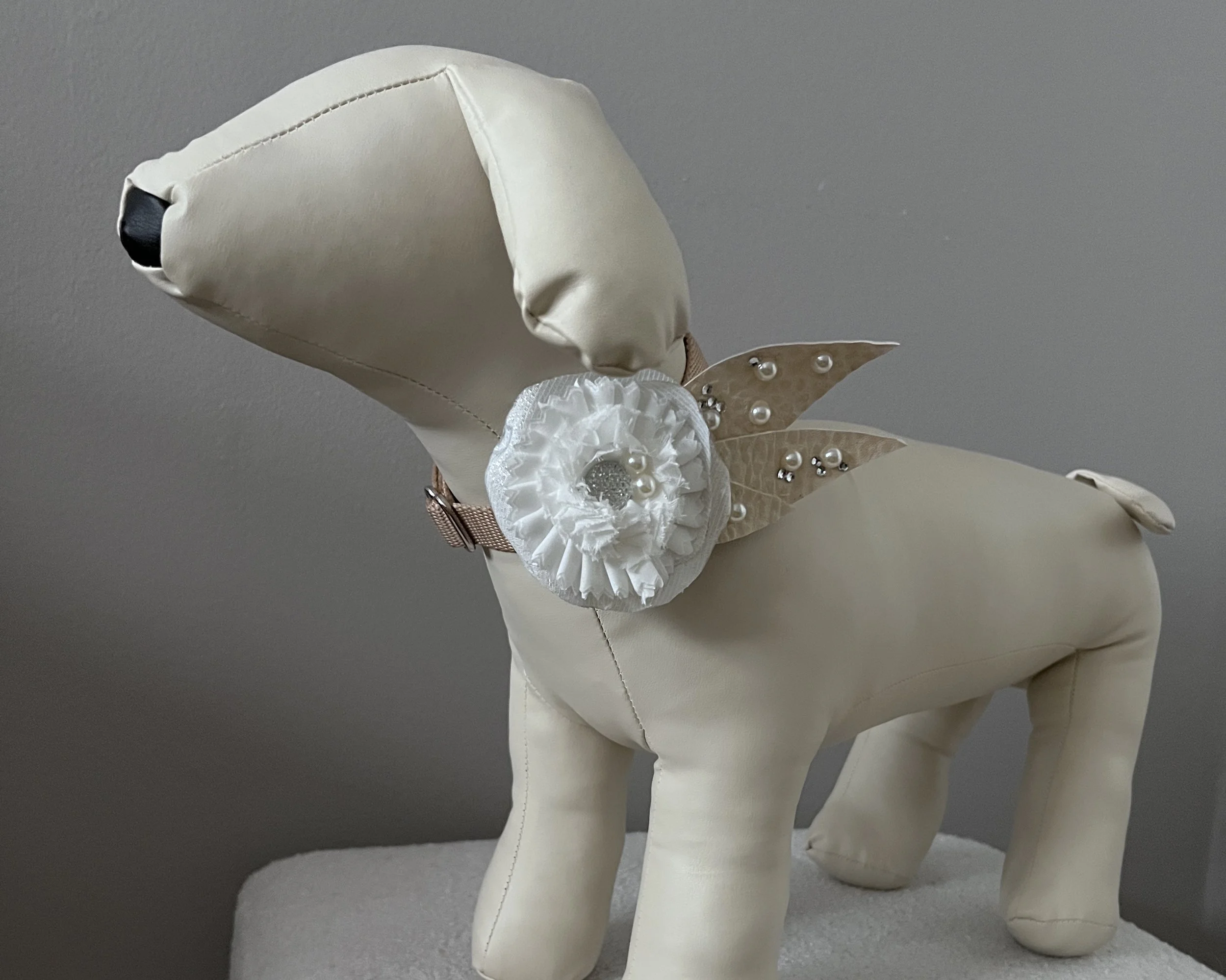 For a more relaxed or bohemian vibe, dogs can wear floral or bohemian-inspired accessories such as flower crowns, leis or colorful bandanas. This can create a fun and whimsical look for your pet. The Pups of Honor Collection offers handmade shabby chic collar accessories that are super easy to put on your existing dog collar. They’re made of natural cotton, satin, lace with crystal and pearl embellishments. View the collection here