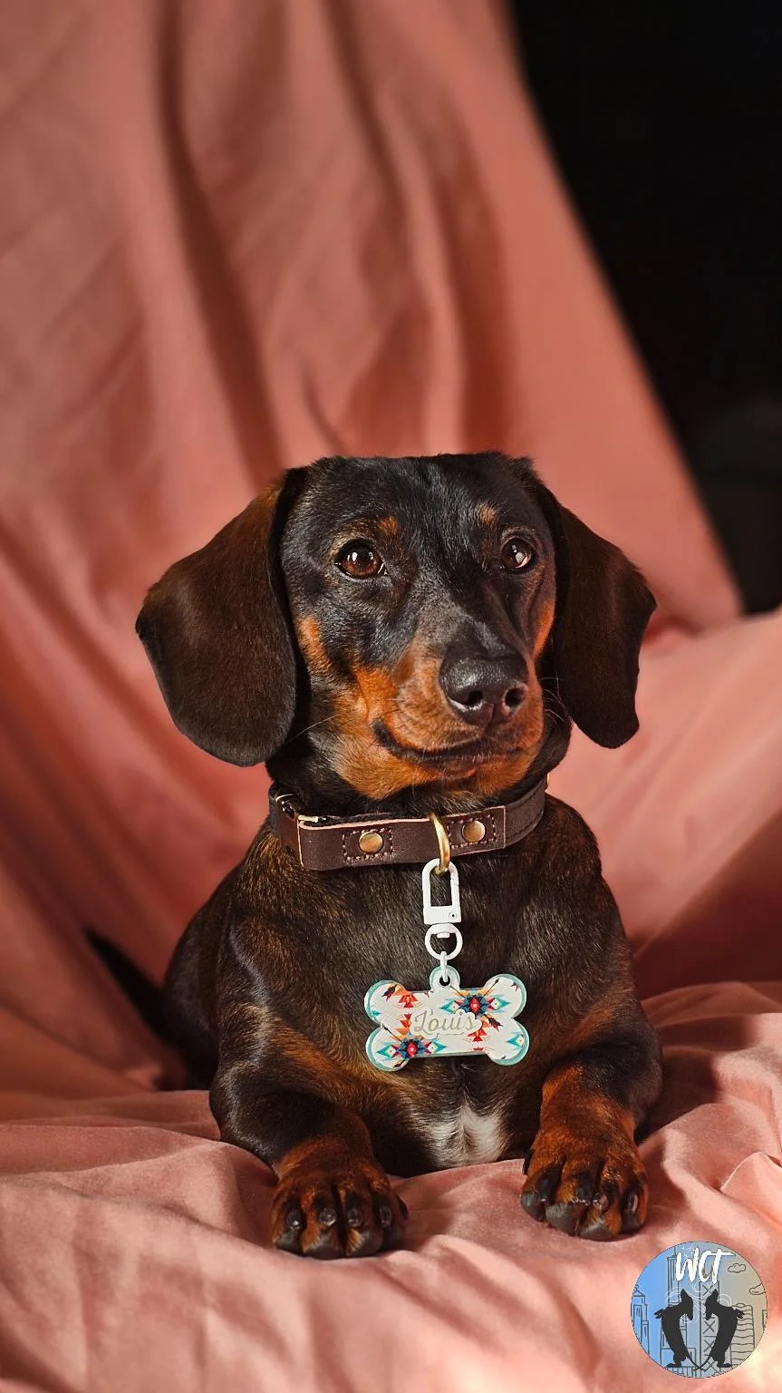 The Koda Pet Tag features a colorful Southwestern pattern on a white background with a turquoise backing. Your pet's name will be in a shimmer gold font and enhanced with a white border. The name is UV Resin coated for waterproofing. This tag measures 2 inches and offers a gold and white spring clasp for easy attachment and removal.