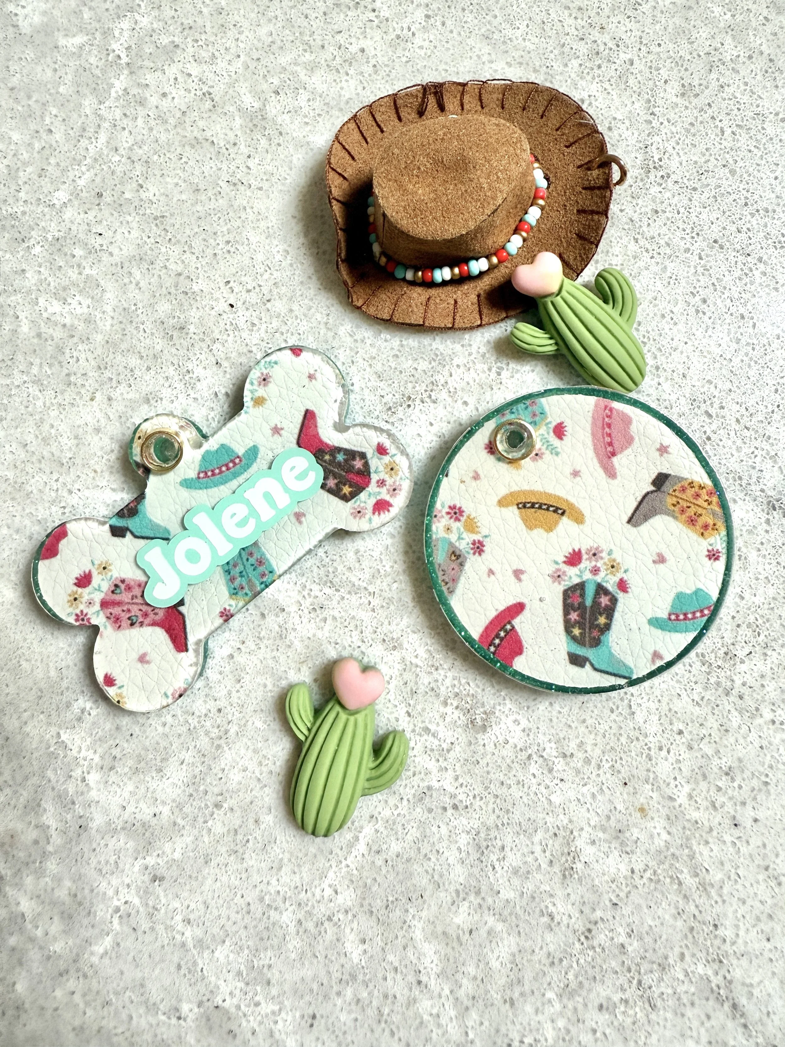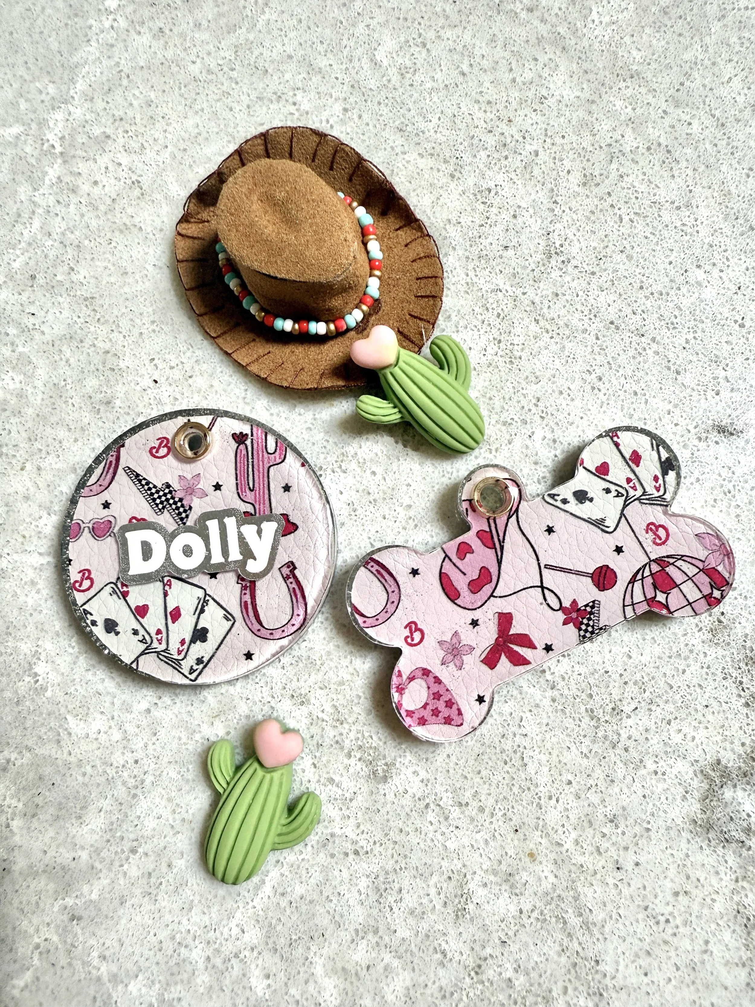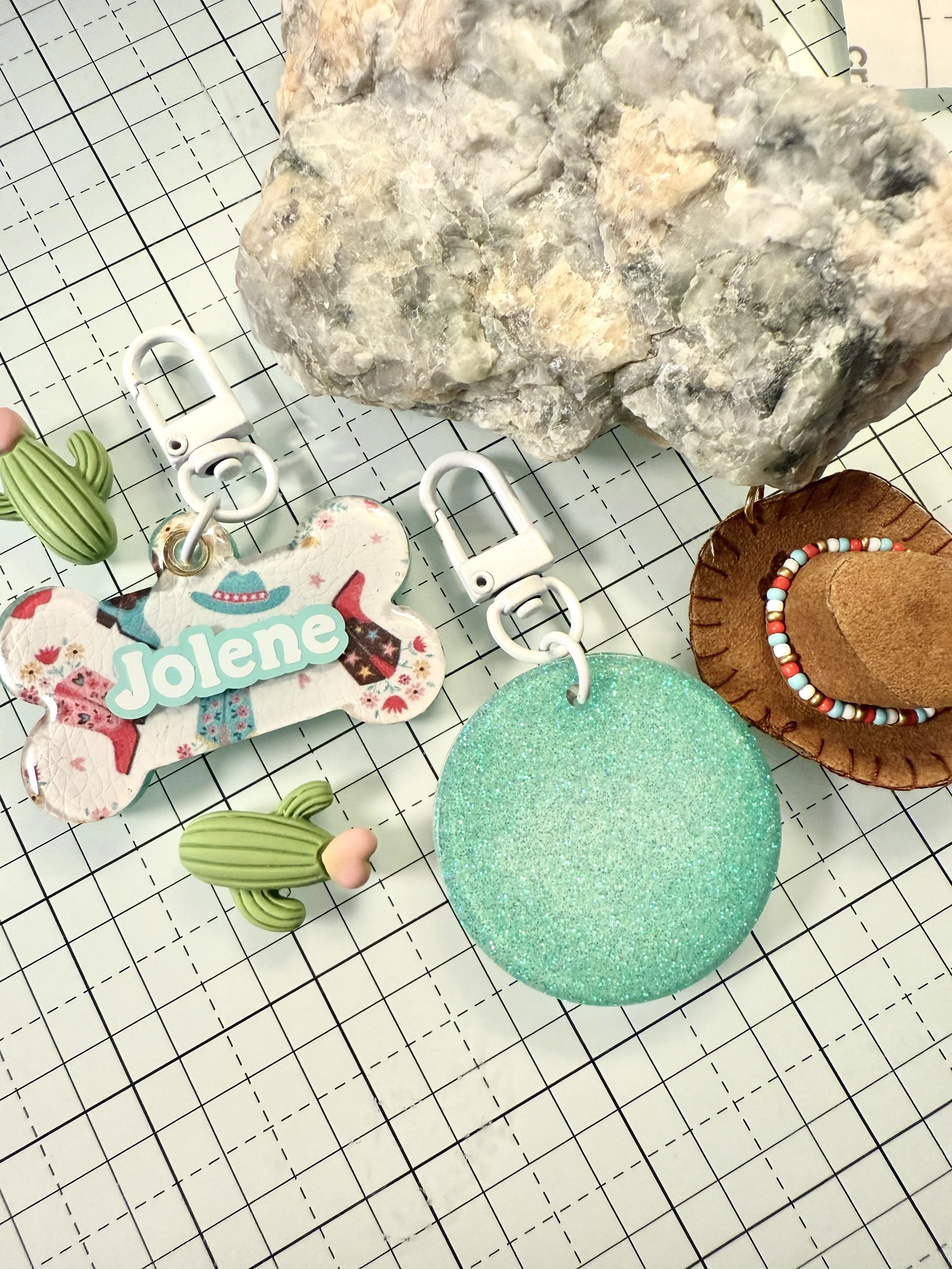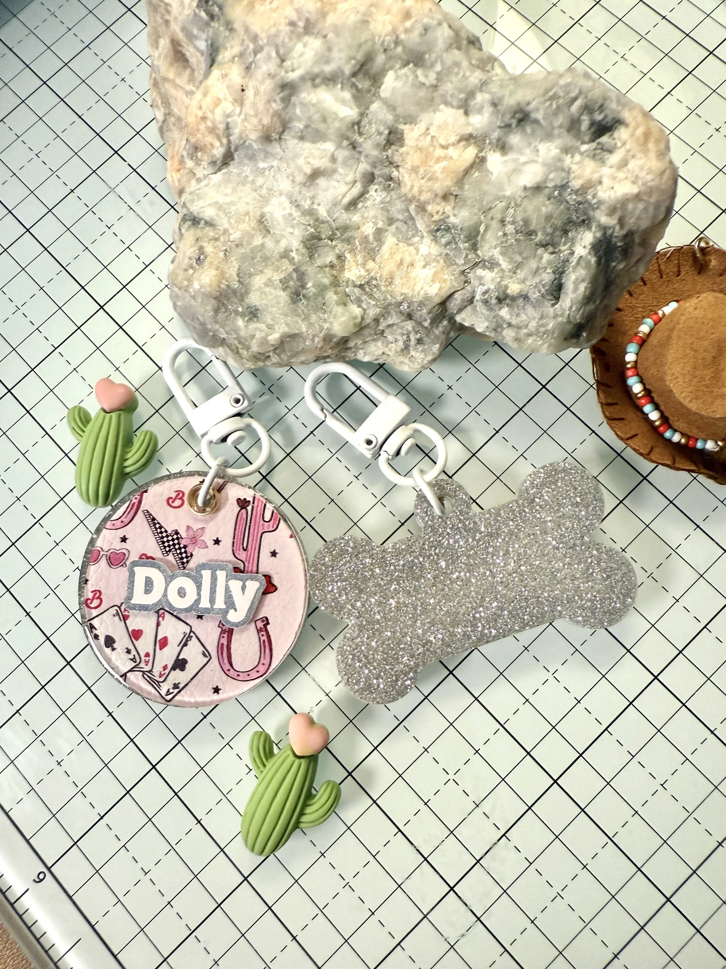 The Rusty Pet Tag offers a classic red paisley print with a shimmering, swirl copper backing. Your pet's name will be in white and UV Resin coated for waterproofing. This tag measures 2 inches and offers a burnished gold and white spring clasp for easy attachment and removal.